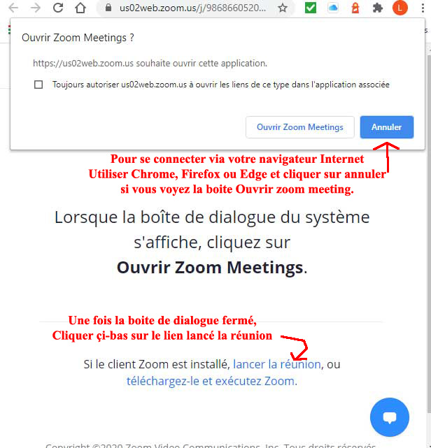 Cliquer sur le lien dans votre courriel d'invitation que vous allez recevoir. Votre navigateur Internet va s'ouvrir et vous allez voir cette page. Il se peut qu'une boite de dialogues s'ouvre et vous demande d'ouvrir une possible application Zoom, installer sur votre appareil. Choisir de cliquer sur le bouton annuler pour fermer cette boite. Une fois sur la page, ou il disent : Si le client Zoom est installé, Lancer la réunion. Cliquer sur le lien : Lancer la réunion. ![]() Une nouvelle option devrait s'afficher, qui dit : Si vous ne pouvez pas télécharger ou exécuter l'application, Rejoingnez la réunion depuis votre navigateur. Cliquer sur le lien : Rejoingnez la réunion depuis votre navigateur. ![]() Une nouvelle fenêtre, affiche un petit formulaire, ou vous devez enter votre nom et cocher la case : Je ne suis pas un robot. Une fois cocher, cliquez sur le bouton bleu rejoindre, dans le bas du formulaire comme sur l'image çi-dessous, et vous allez enter dans la réunion. ![]() Voir toute les informations sur Zoom client Web |